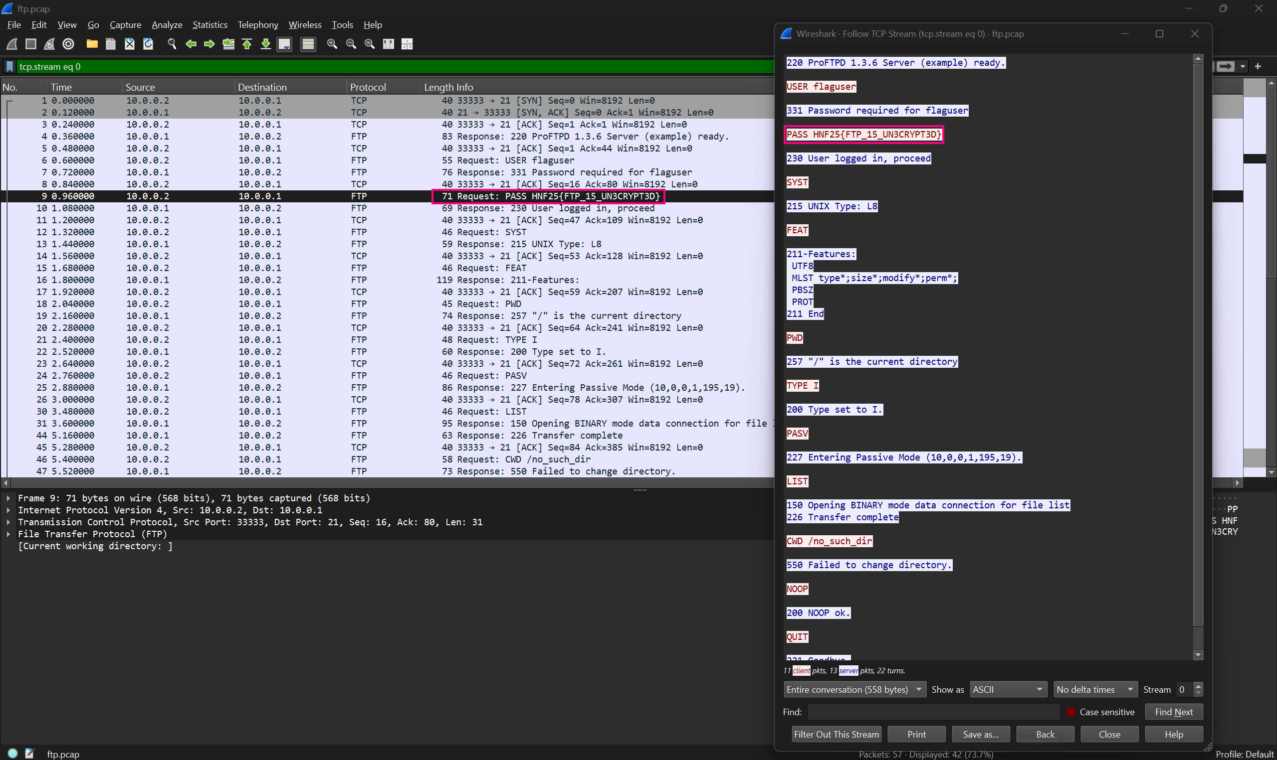 ftp.pcap. It contains the flag in plaintext, so this challenge can be solved in multiple ways. An example is shown below, where the flag is obtained after checking the stream information (communication between the FTP server and client).