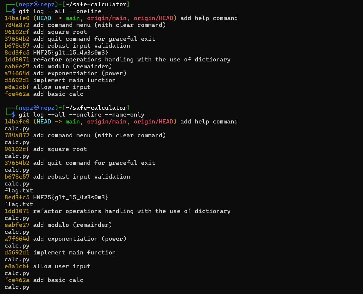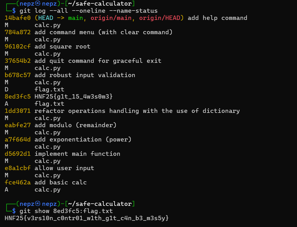 We can see that a file called flag.txt was included in 2 commits, namely 8ed3fc5 - HNF25{g1t_15_4w3s0m3} and b678c57 - add robust input validation.