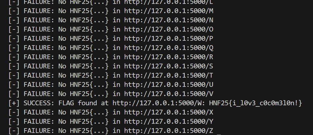 print(f"[!] Error fetching {url}: {e}")As shown below, the flag was found using the script. The secret letter was W.