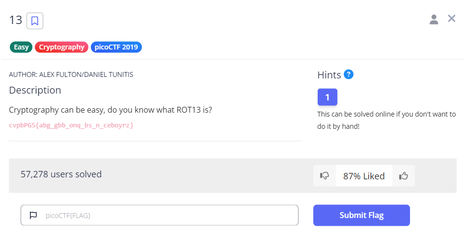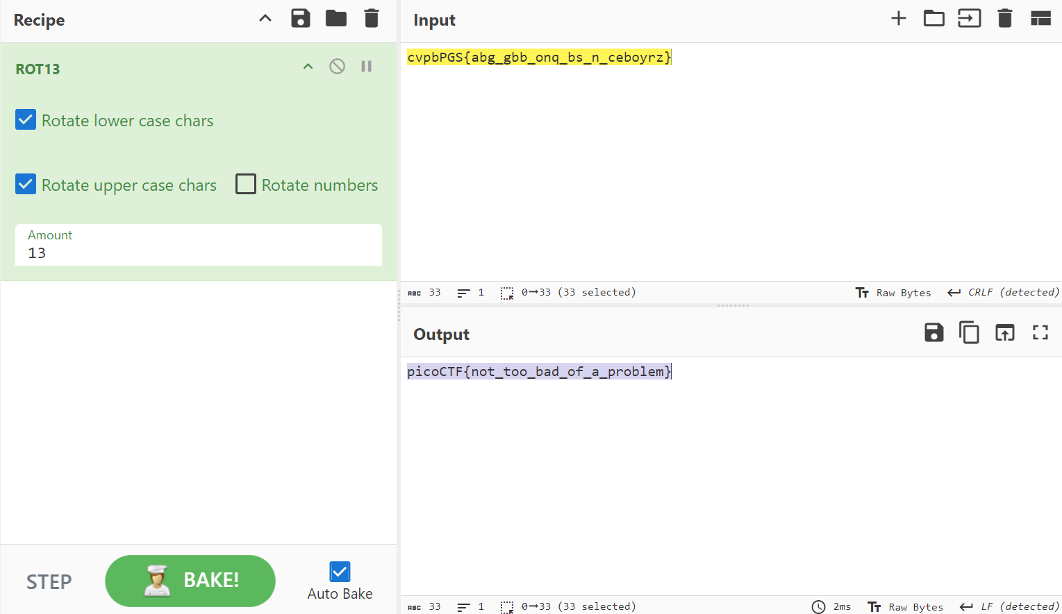 As the description suggests, we only have to copy the string of characters provided and decrypt using ROT13. I used CyberChef to do this, and obtained the flag.