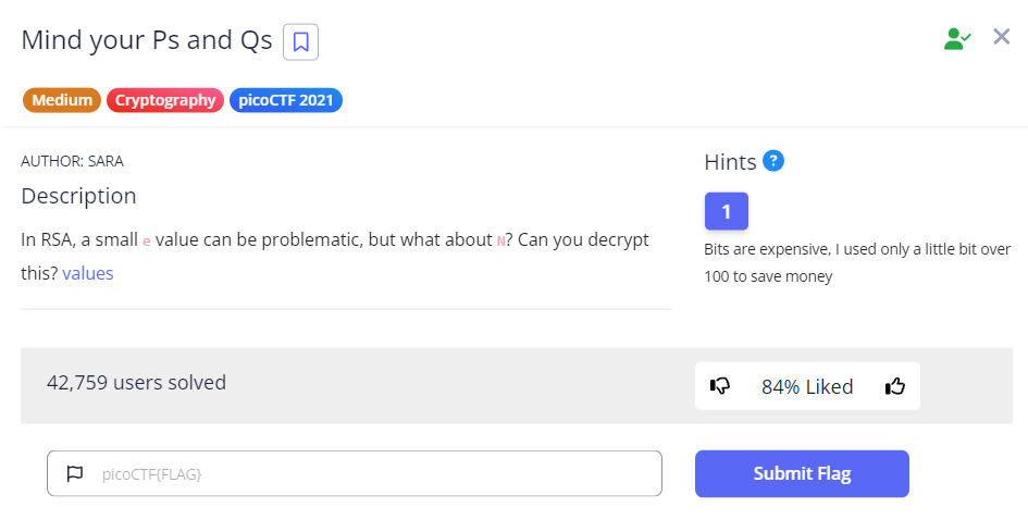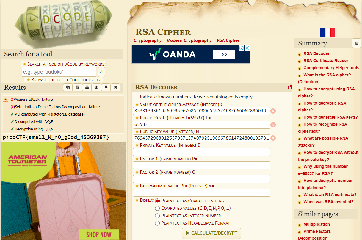 using dcode.fr’s RSA cipher decoder. It computes the values of p