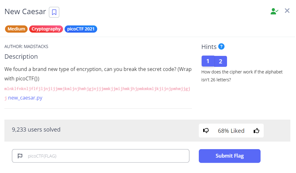 import stringLOWERCASE_OFFSET = ord("a")ALPHABET = string.ascii_lowercase[:16] # Only first 16 alphabetsdef b16_encode(plain): enc = "" for c in plain: binary = "{0:08b}".format(ord(c)) # Converts each character to its binary representation, like such: 01110000 enc += ALPHABET[int(binary[:4], 2)] # Converts the 1st half of the binary representation into a decimal, then use it as an index enc += ALPHABET[int(binary[4:], 2)] # Converts the 2nd half of the binary representation into a decimal, then use it as an index return encdef shift(c, k): t1 = ord(c) - LOWERCASE_OFFSET t2 = ord(k) - LOWERCASE_OFFSET return ALPHABET[(t1 + t2) % len(ALPHABET)] # Shift c by the index of k, wrap around using moduloflag = "REDACTED"key = "REDACTED"assert all([k in ALPHABET for k in key]) # Checks if the key is in the alphabetassert len(key) == 1 # Checks if the key is only 1 character longb16 = b16_encode(flag)enc = ""for i, c in enumerate(b16): enc += shift(c, key[i % len(key)]) print(enc)