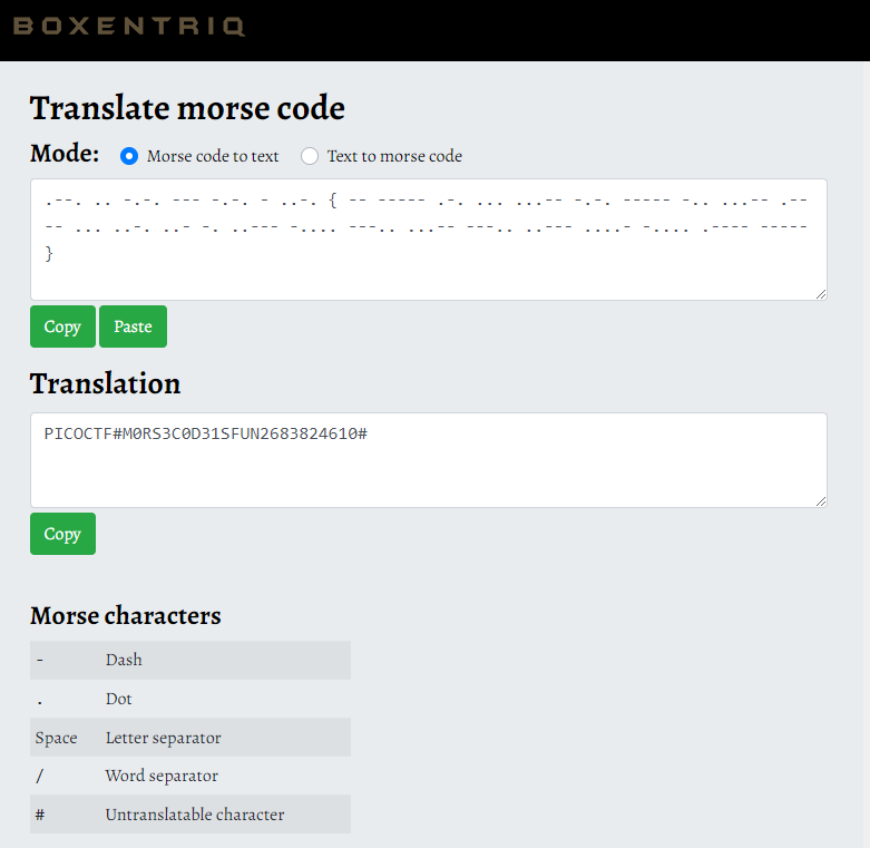 However, since the curly braces {} are not regarded as morse characters (and therefore are not translated), they are replaced with hashtags “#” instead by the translator. Thus we will have to manually replace the hashtags ‘#’ with curly braces ‘{}’ accordingly to get the correct flag.