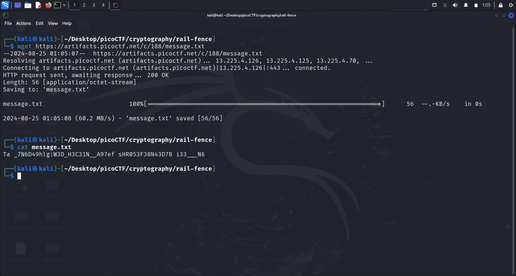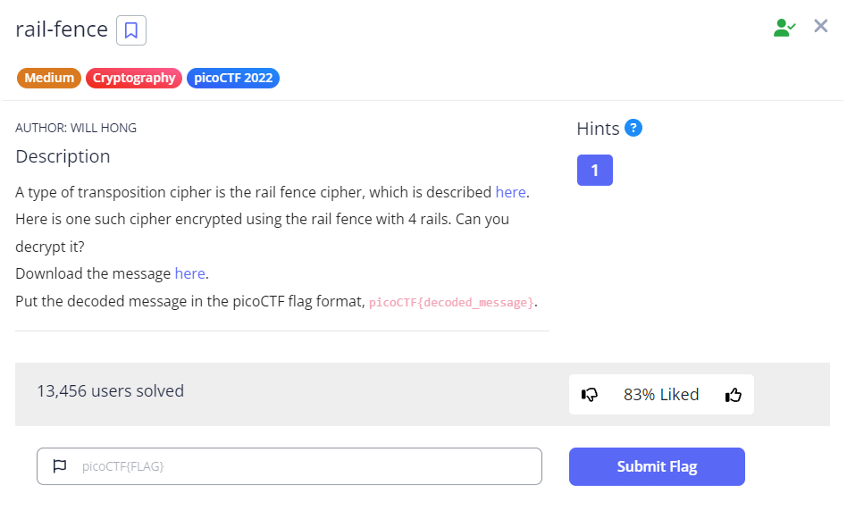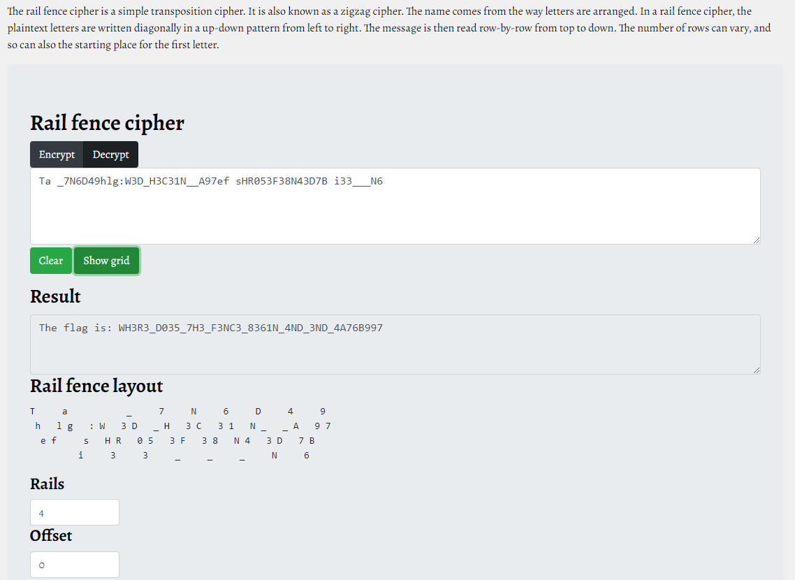 Using an online Rail Fence Cipher decoder, we can specify the number of rails to decode the ciphertext and obtain the flag.