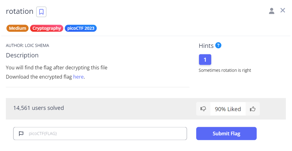 As the challenge name and hint suggest, the flag is probably encrypted using a caesar cipher. We first download the file using wget