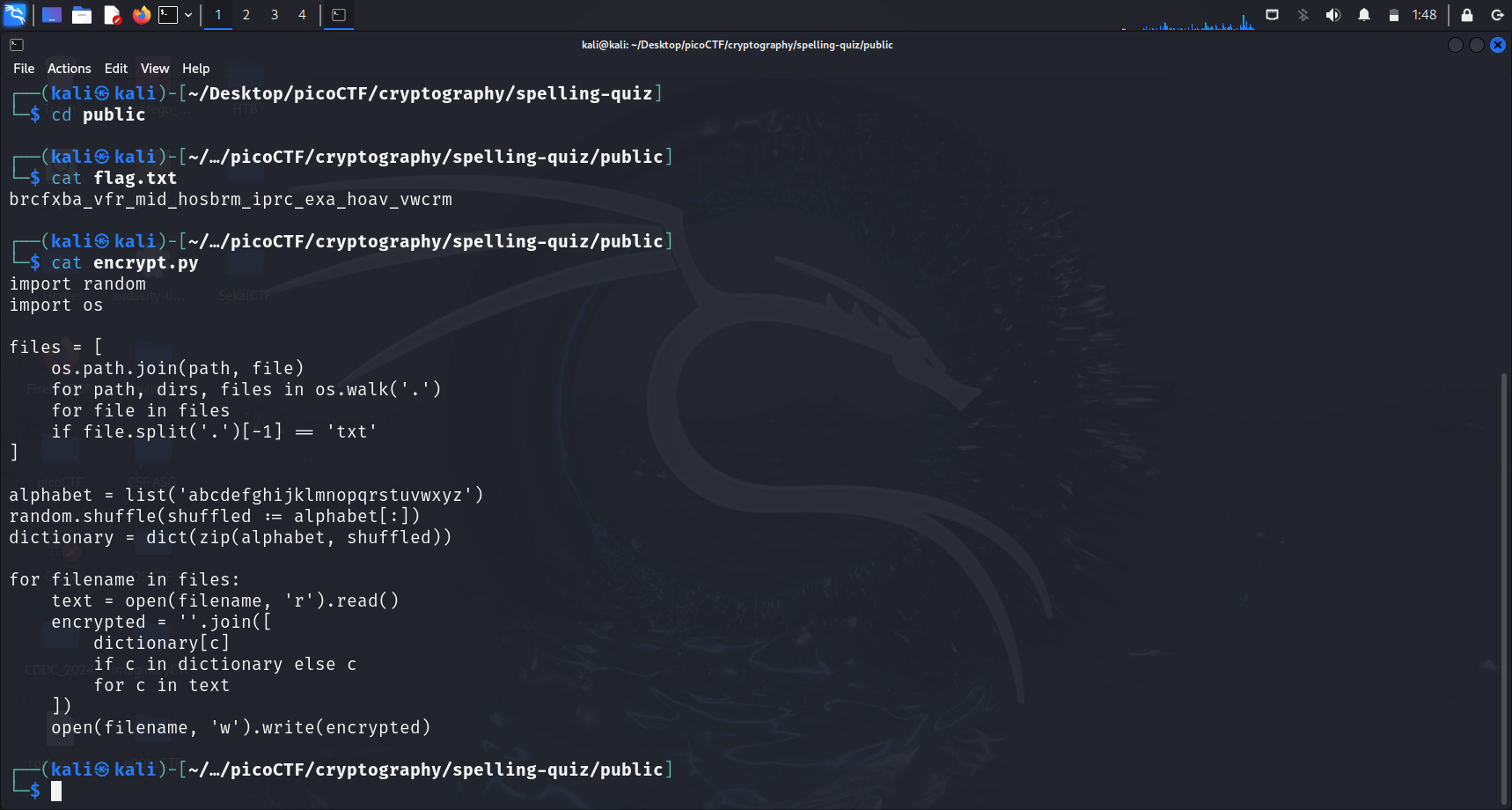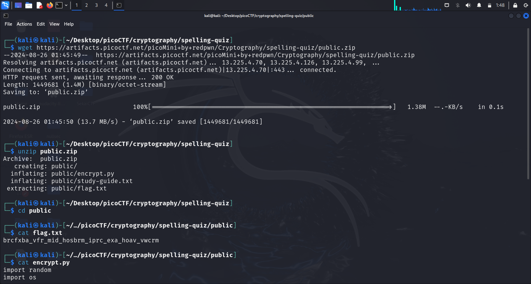 We proceed to unzip this file (public.zip), creating another directory called public, with 3 files in it, namely encrypt.py, study-guide.txt and flag.txt.