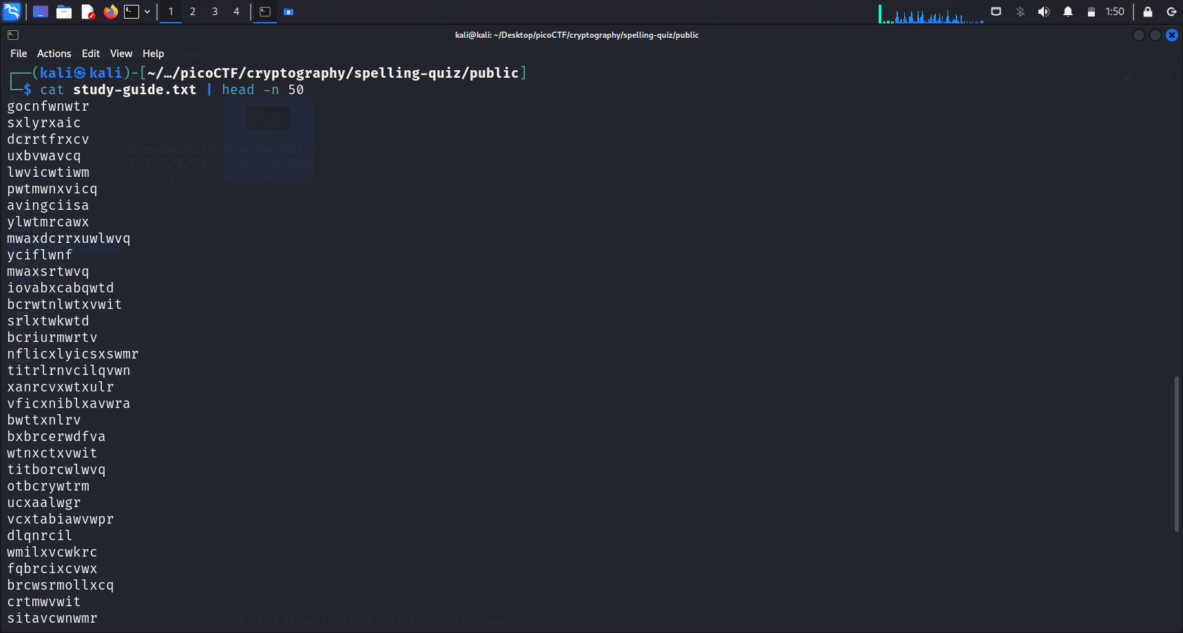 Running cat study-guide.txt displays the 272543 encrypted lines in this file.