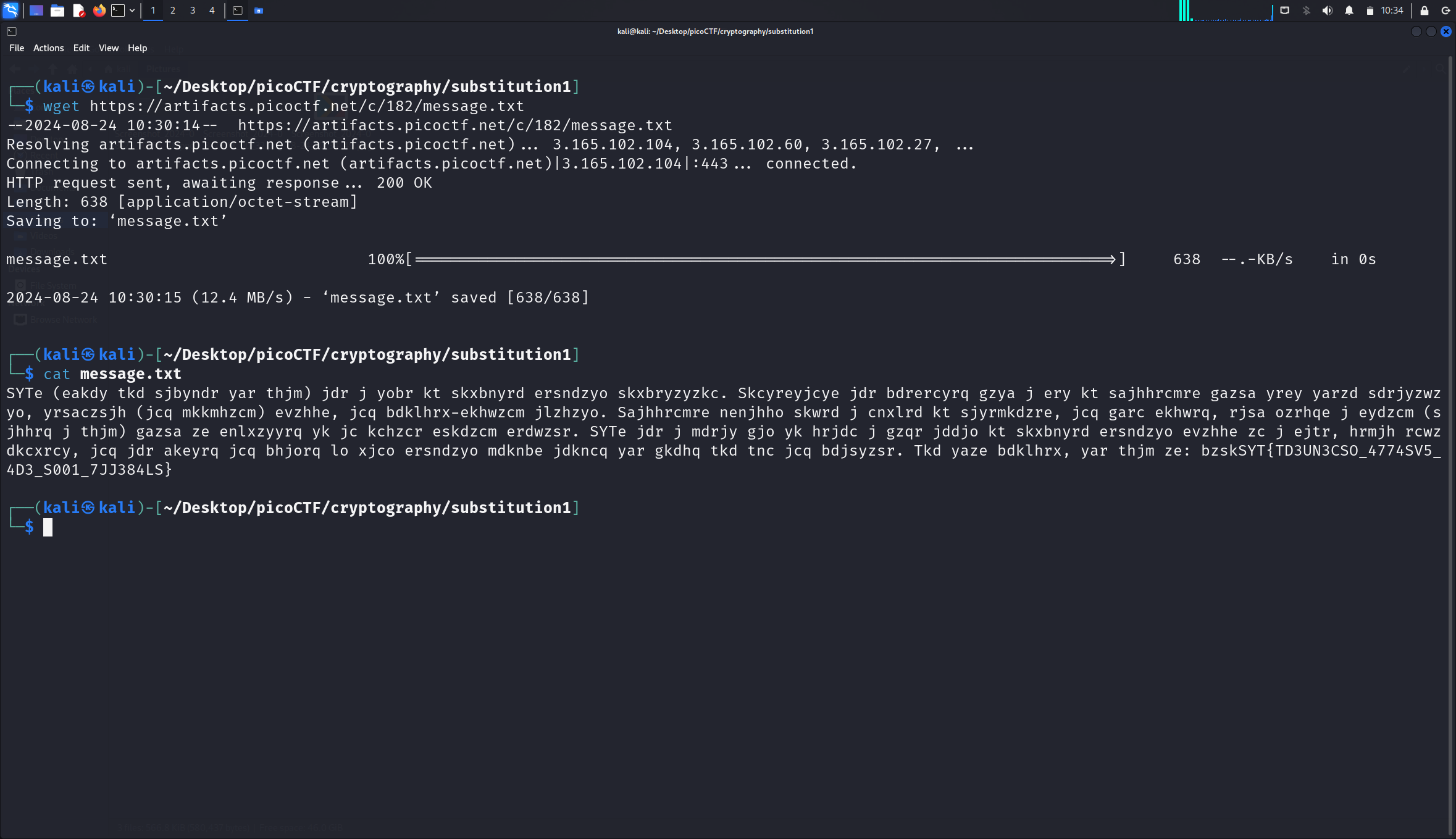 For this challenge, we will basically repeat the same steps we did to retrieve the flag for the substitution0 challenge. We first download the file using wget