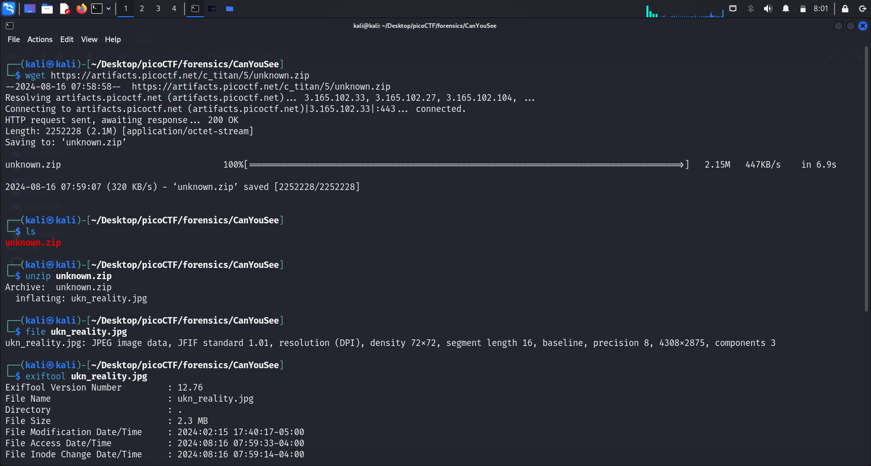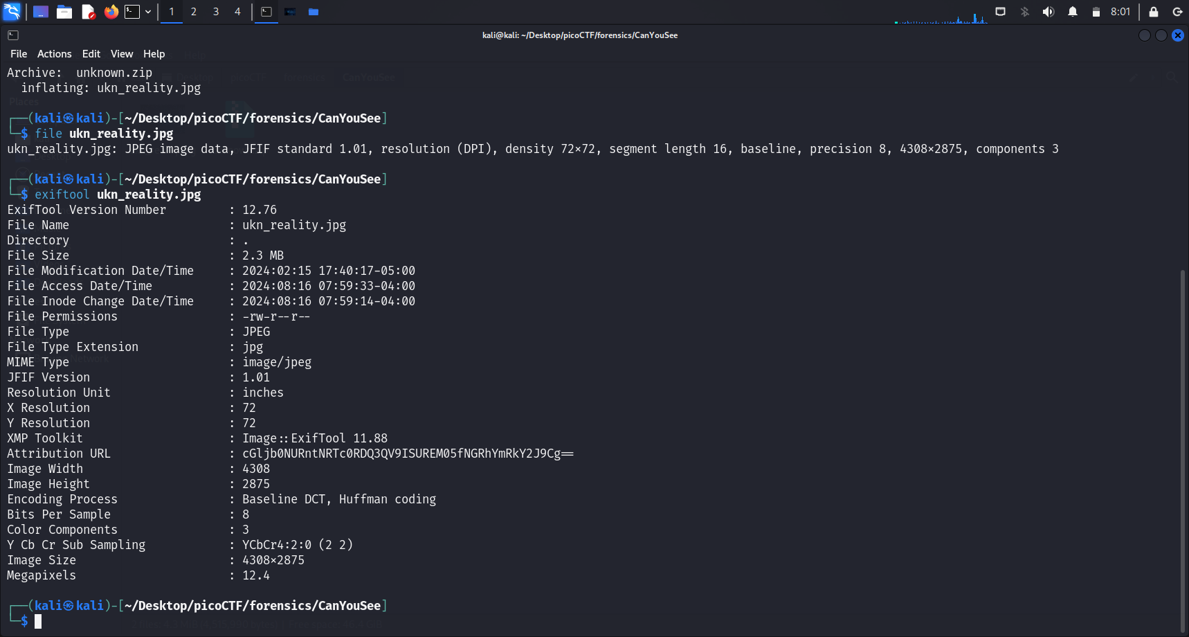 The clue seems to be hinting us to check the metadata of the picture. We shall do just that.