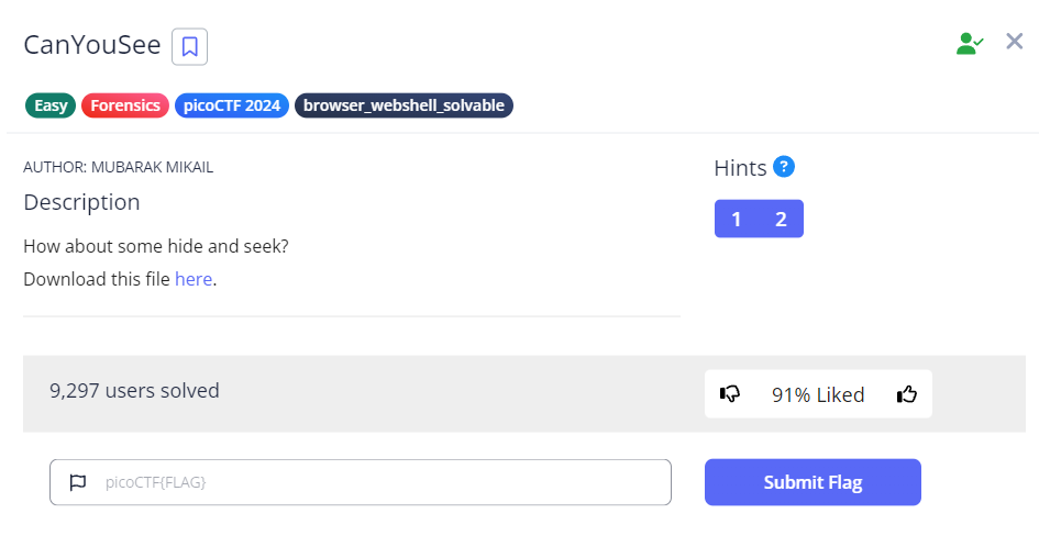 Right off the bat, the description seems interesting. “Hide and seek” implies that the flag may be hidden and may not be easily seen.
