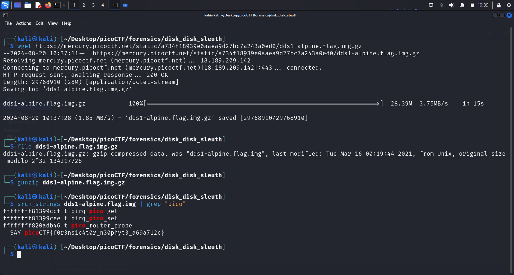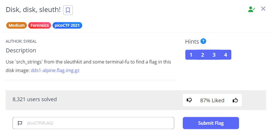 This seems like a straightforward The Sleuth Kit (TSK) challenge. As per normal, we begin by downloading the compressed disk image using wget