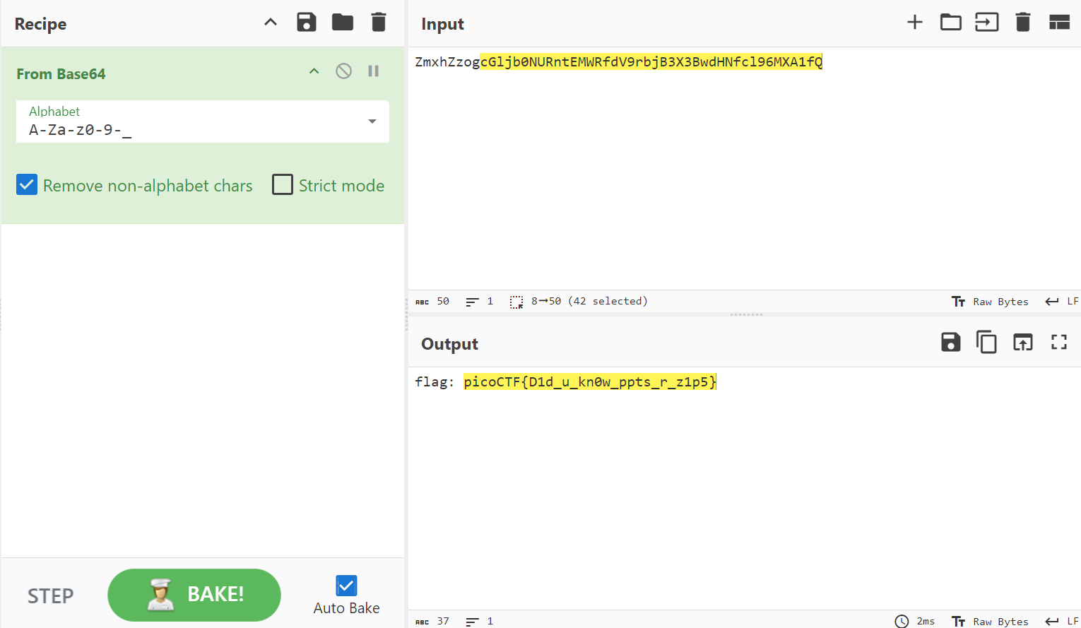 ” is base64 encoded. Let’s head over to CyberChef to test this hypothesis.