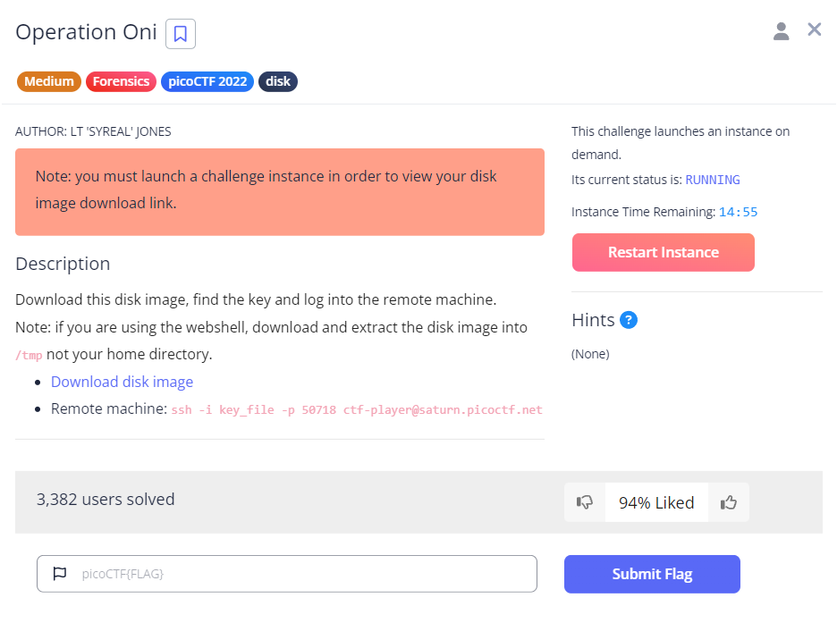 From the description, it looks like we will have to download the disk image and retrieve an ssh key to connect to an ssh server afterwards, in order to obtain our flag.
