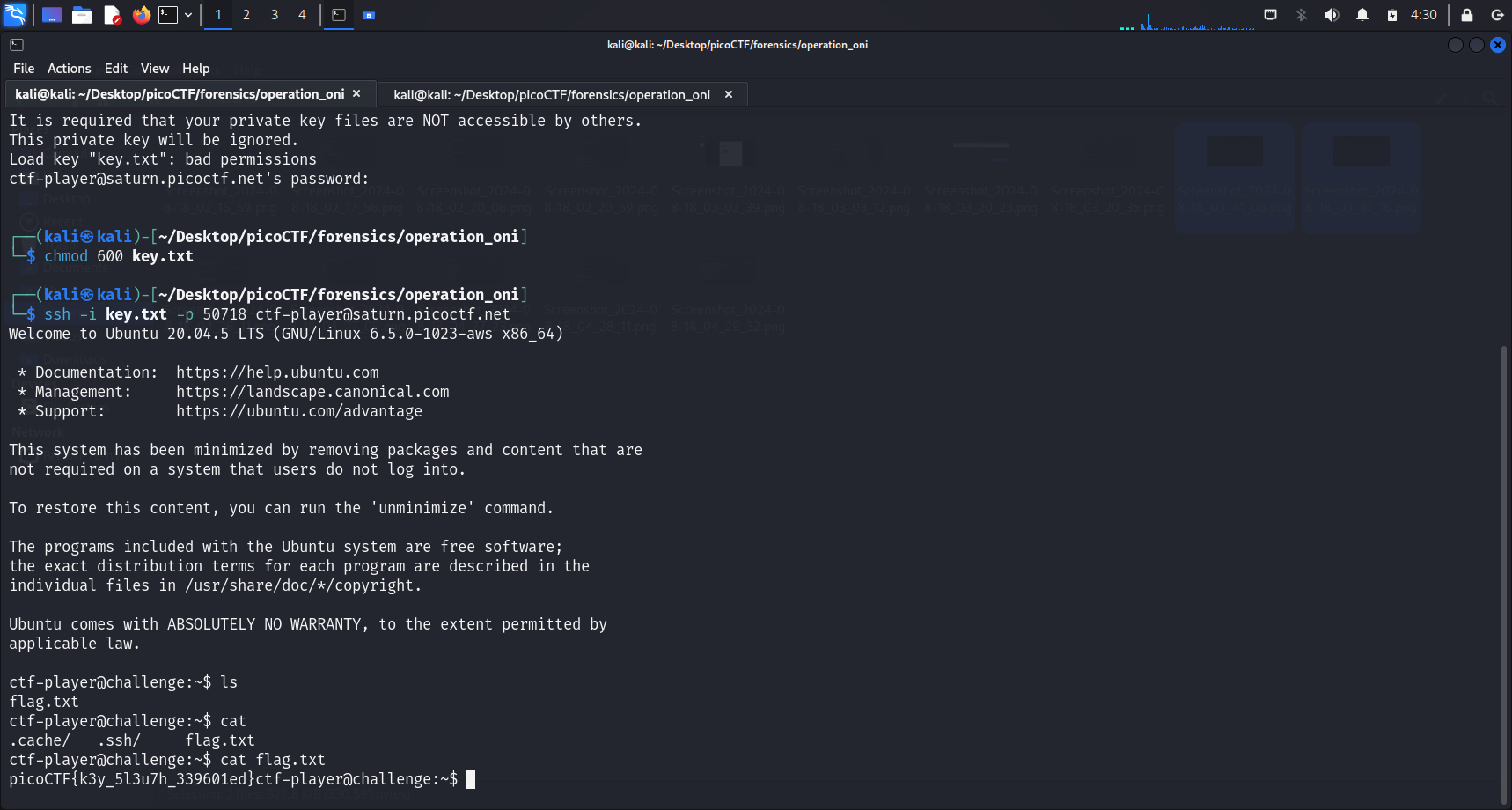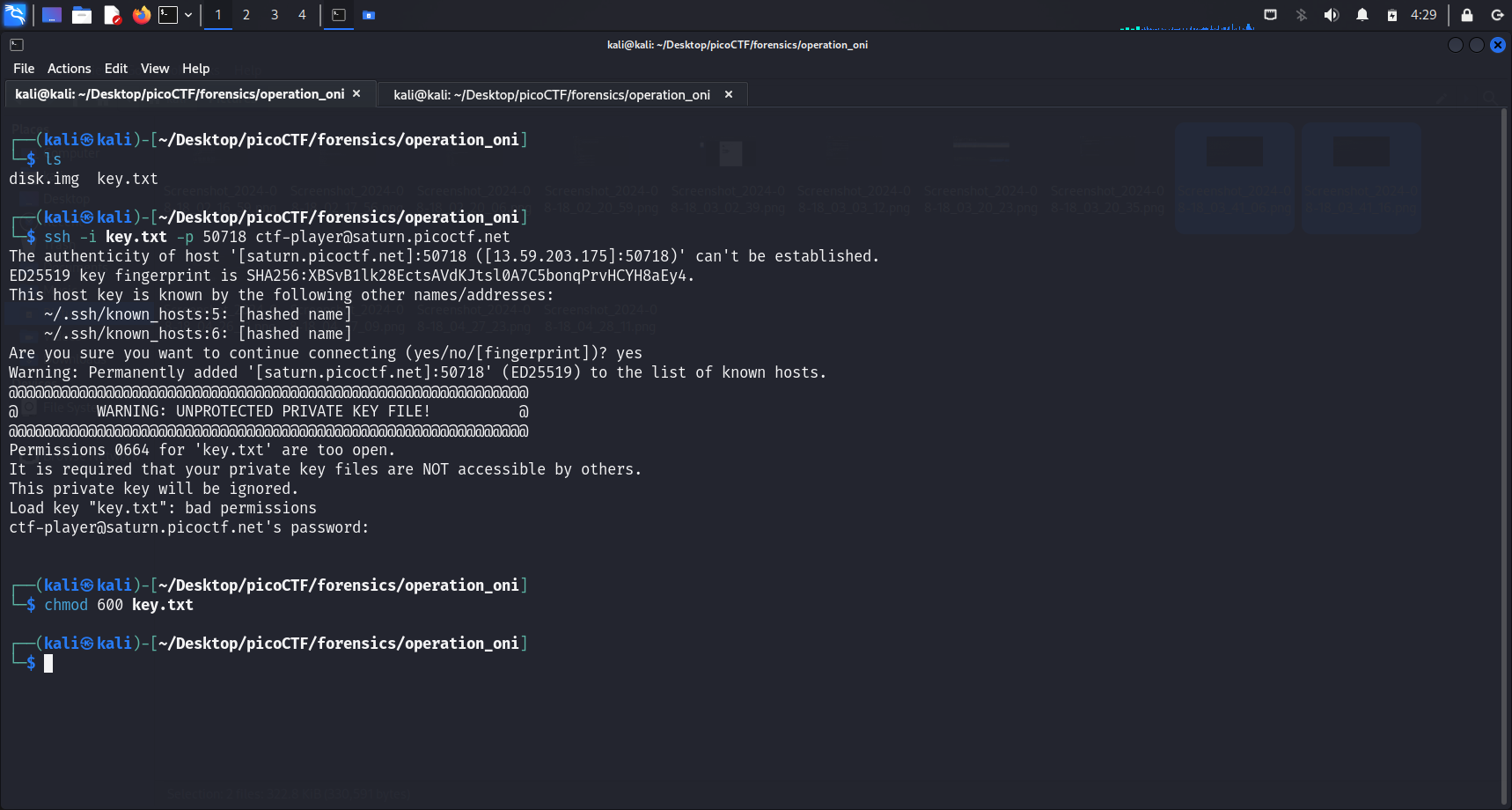 After changing the file permissions, we can successfully connect to the SSH server. We can run