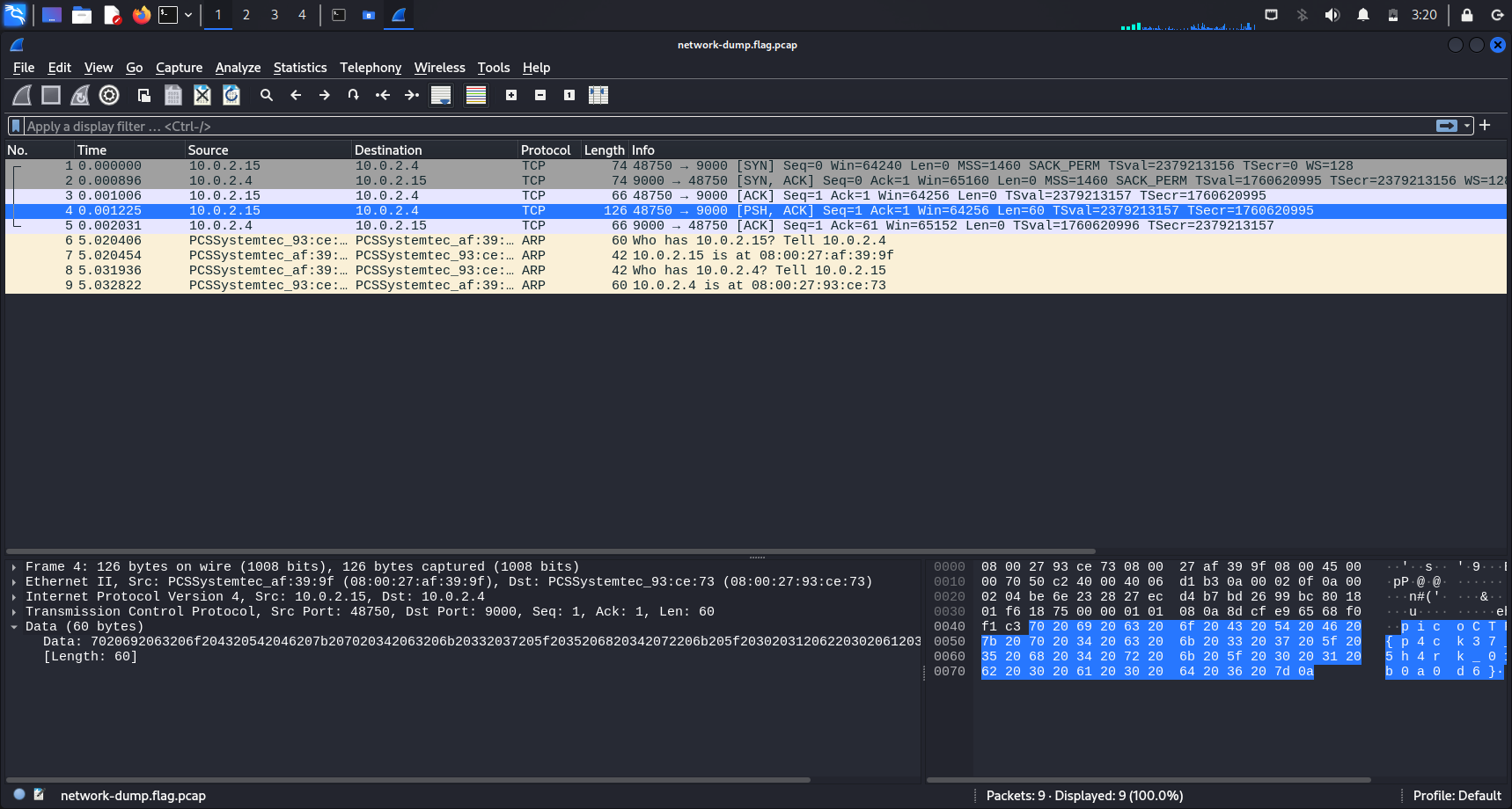 Since there are only 9 packets in this pcap file, finding the flag was straightforward. Display filters was not necessary.