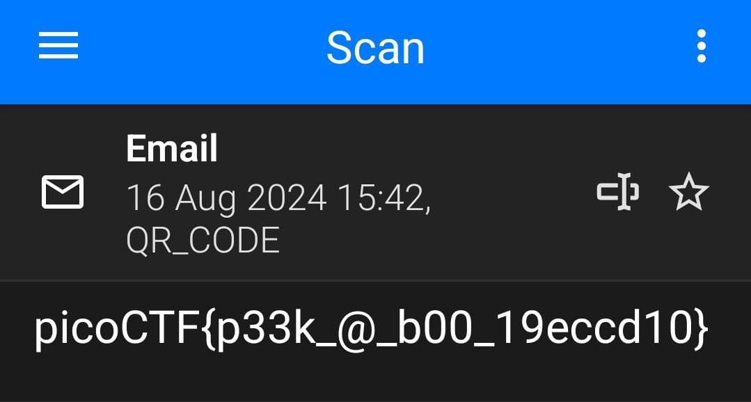 From here, we can just use a QR Code scanner to retrieve the flag. For this, I used a random QR Code scanner on my mobile phone. However, you can basically use any available ones.