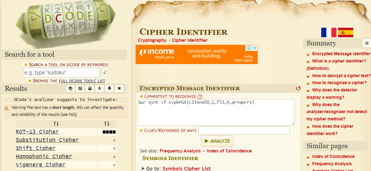 Since I did not intuitively realise which cipher was used to encrypt the flag, I used a Cipher Identifier to do the job for me.