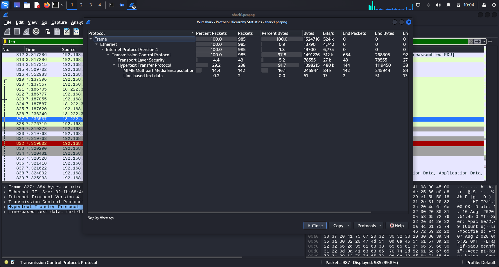 After opening the file in Wireshark, I first went to check the Protocol Hierarchy, and decided to use tcp