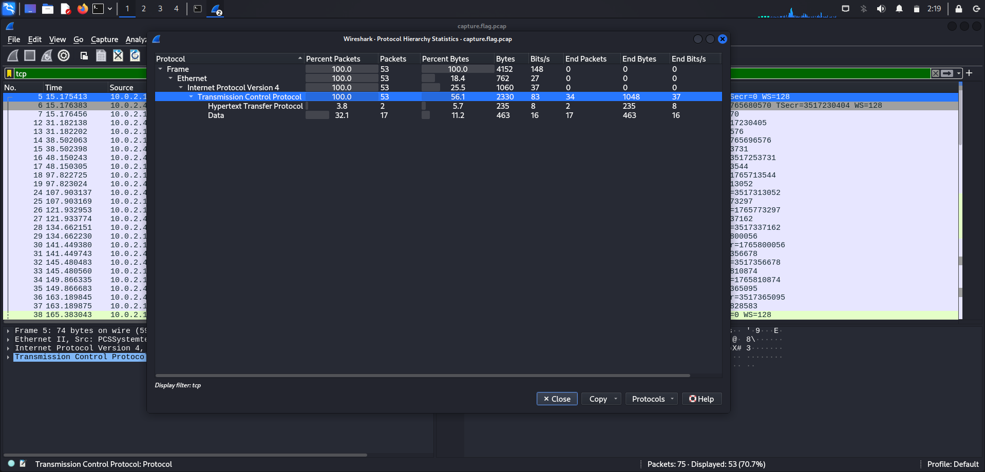 I proceed to check the protocol hierarchy to understand what protocols are used in this communication. Since 100% of the packets used TCP, I used TCP as a packet filter for further analysis.