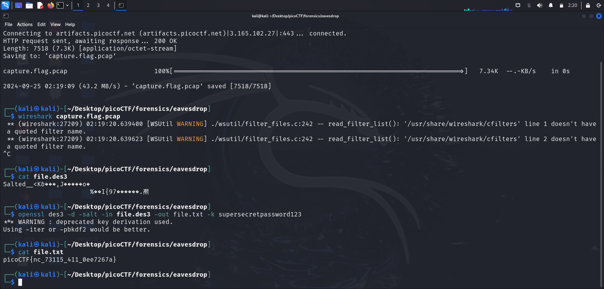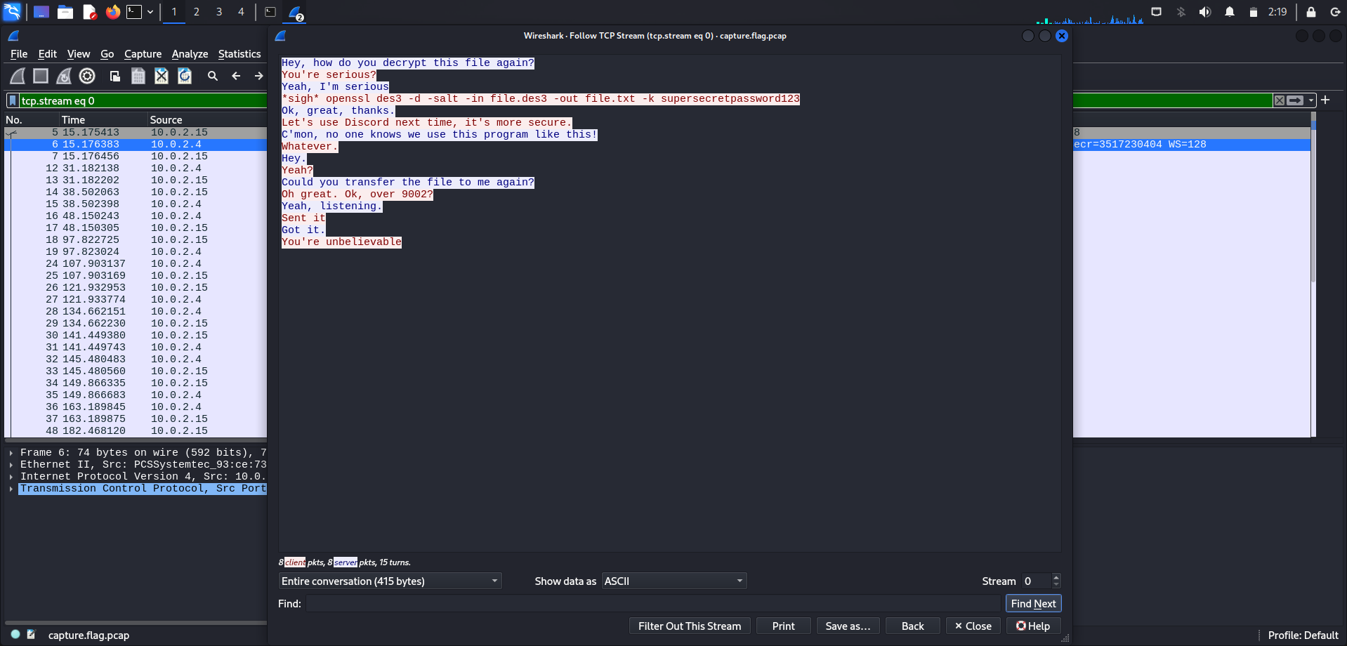 I saved this data to a file named file.des3, and ran the command provided to us in the conversation, which decrypted the contents and saved the flag in a file named file.txt.
