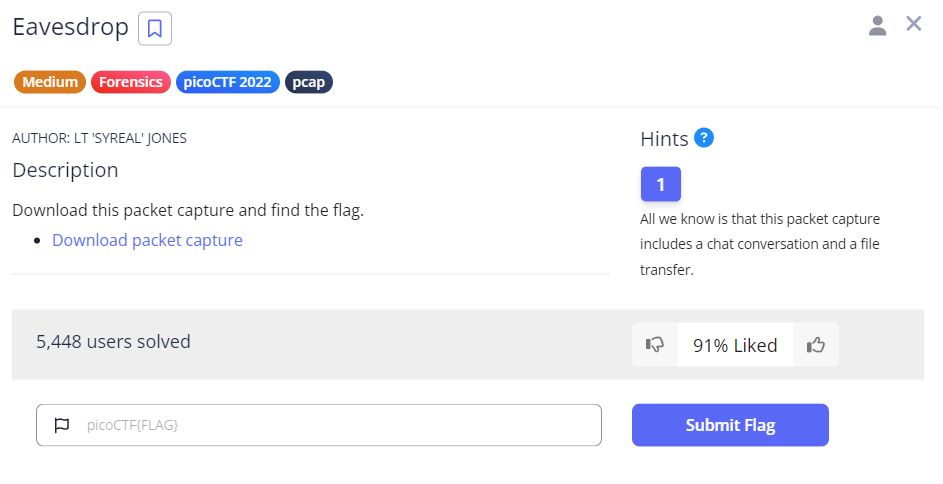 PicoCTF Hint: All we know is that this packet capture includes a chat conversation and a file transfer.