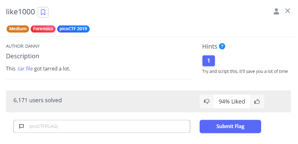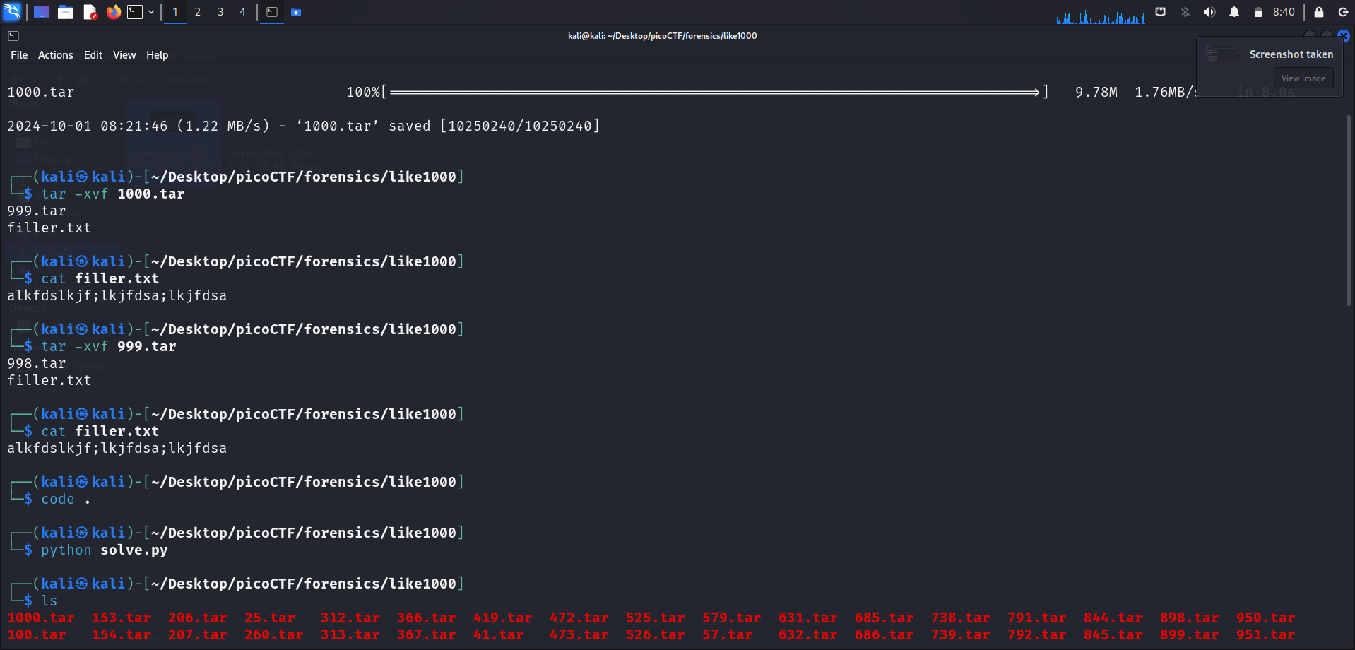 We first download the provided tar file by running wget <link>. The downloaded file is named 1000.tar. To extract tar files, I usually run the following command: