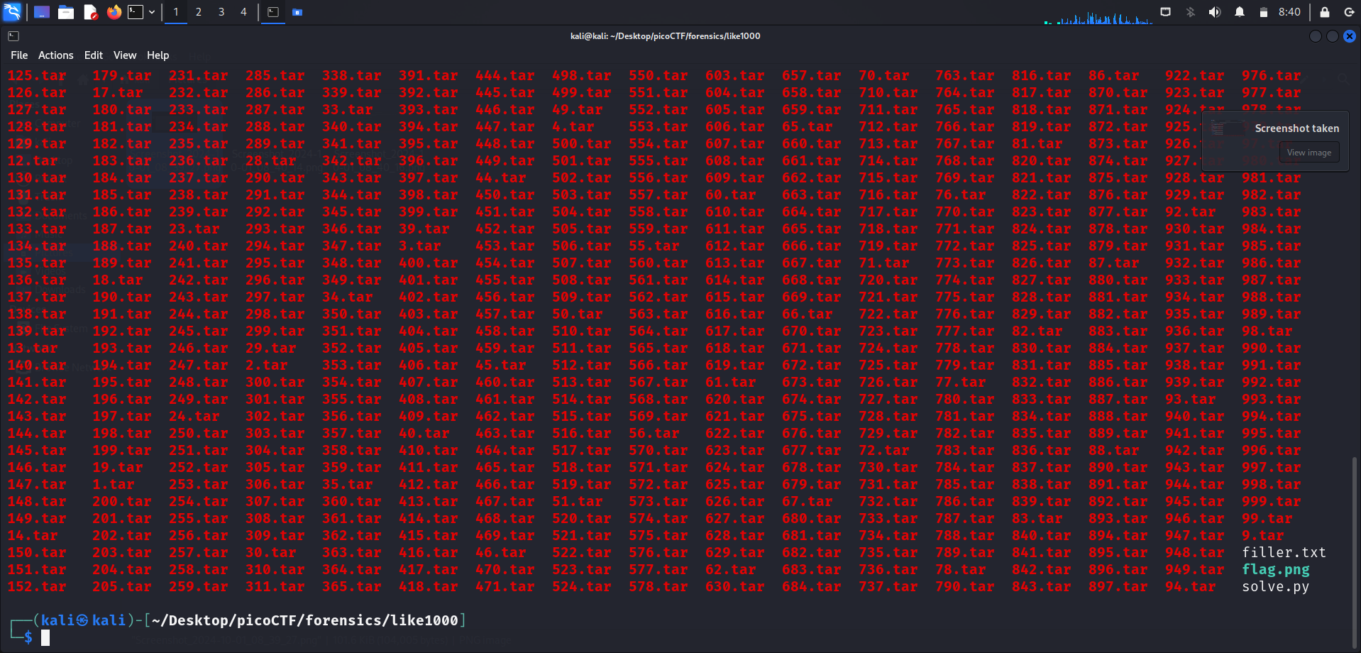 Running the script recursively extracts the existing tar files in the directory we are in. Running ls after successful execution of the script reveals that a file named flag.png created in this directory.