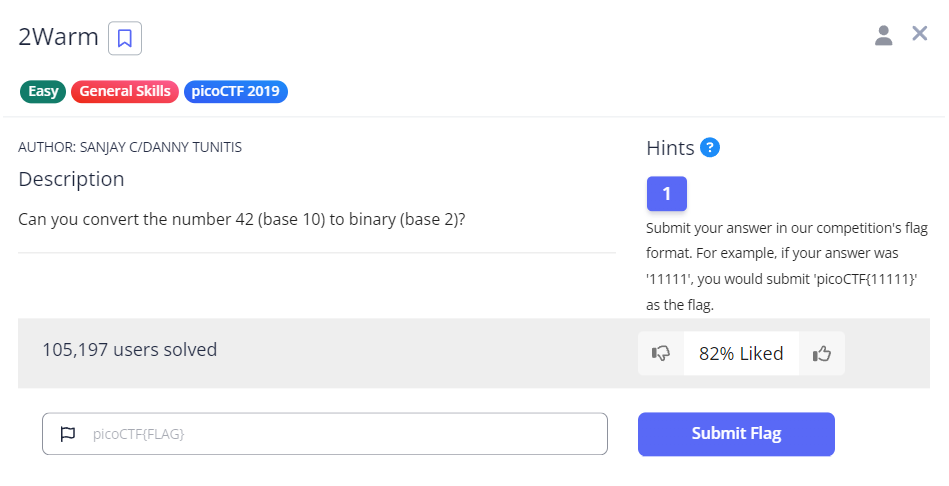 The challenge description instructs us to convert the number 42 to binary. We can use any online base 10 to base 2 conversion tool to do this. We can even do it manually.