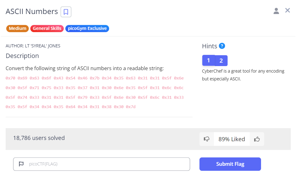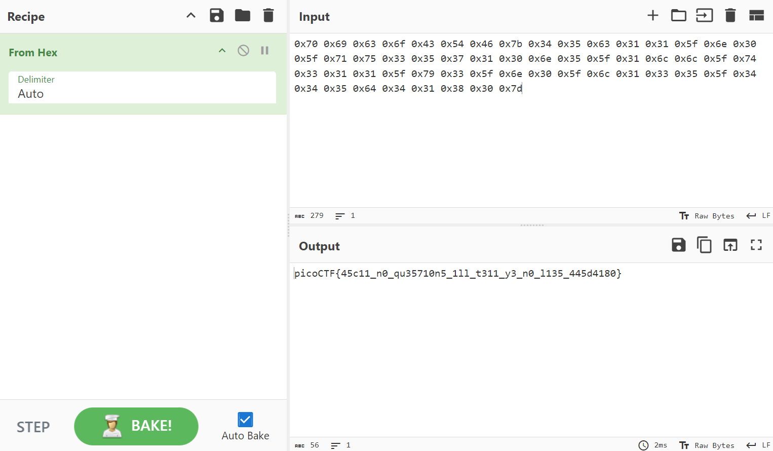 PicoCTF Hint: CyberChef is a great tool for any encoding but especially ASCII.
