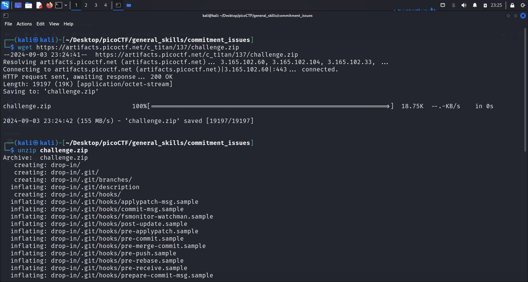We start off by downloading the challenge file using wget <link>. It was a file called challenge.zip, so we proceed to unzip it. Based on the output of the unzipping process, we can see many files and directories created under a .git folder.