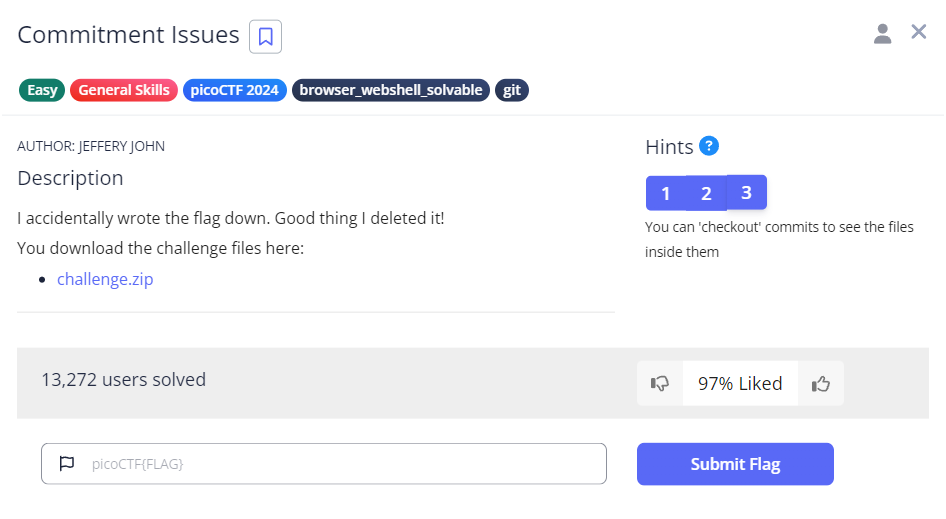 In this challenge, we will be playing with Git and Git commands. There’s a word play on Git commits in the challenge name. The hints given also hinted that this challenge is associated with version control, specifically using Git.