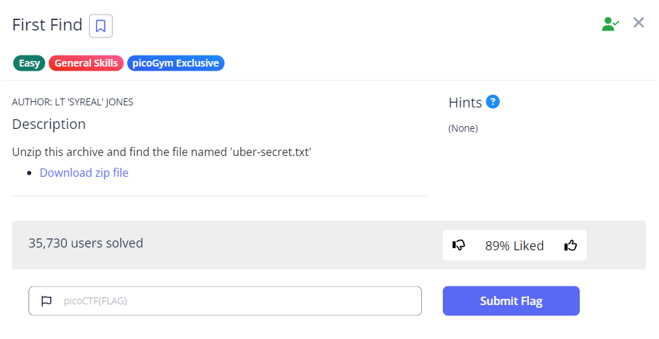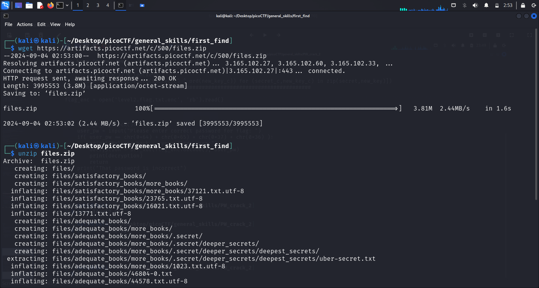 , unzip the file, and then find the full path to the file named uber-secret.txt