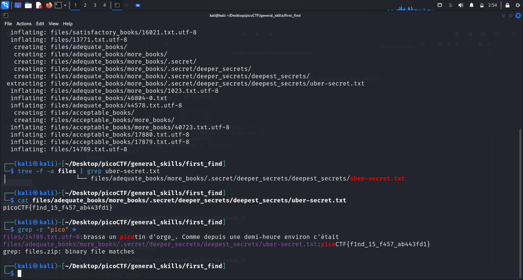 The above command can be used if we want to recursively check if the contents of files in the different directories contain our search term. For this challenge specifically, using the search term “pico” will allow us to get the flag.