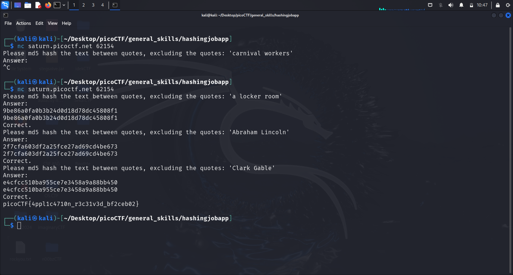 After using this command to connect to the server, I realised what the challenge was all about. We are given a random text, and we are required to provide the MD5 hash of the text. After submitting 3 correct MD5 hashes of 3 different strings, we are given the flag.