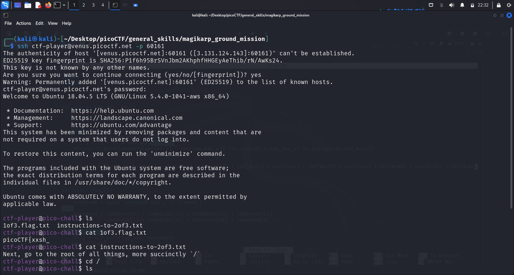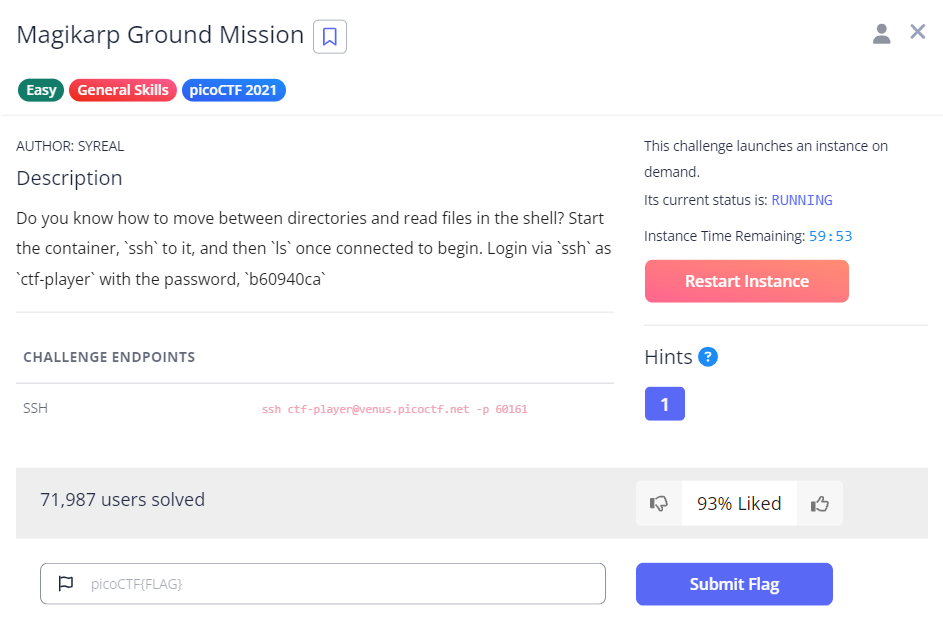 This allows us to SSH into the picoCTF server on port 60161 as ctf-player