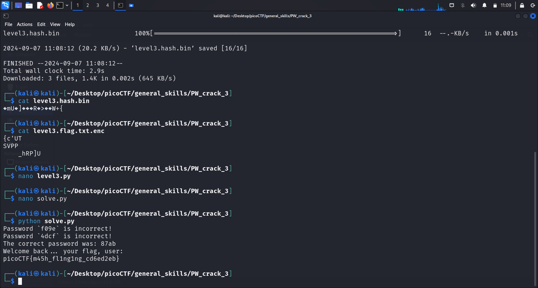 Running cat on both level3.hash.bin and level3.flag.txt.enc displayed gibberish, as expected. Let’s dive into the python script provided instead. I used nano to do this so that I can fix the code immediately if required. I’ve attached the full code below.