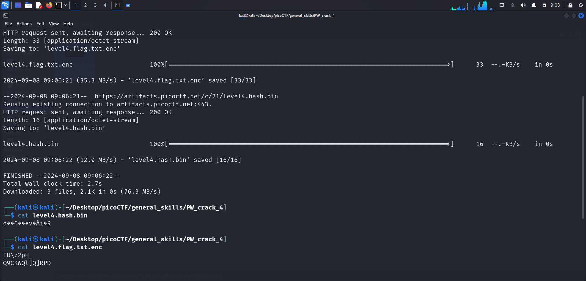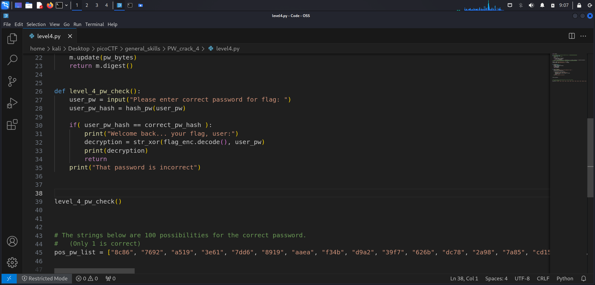 In this challenge, we are provided with 3 files, as usual. The files, in no particular order, are level4.flag.txt.enc, level4.hash.bin and level4.py.