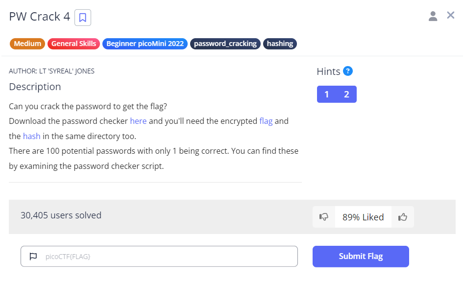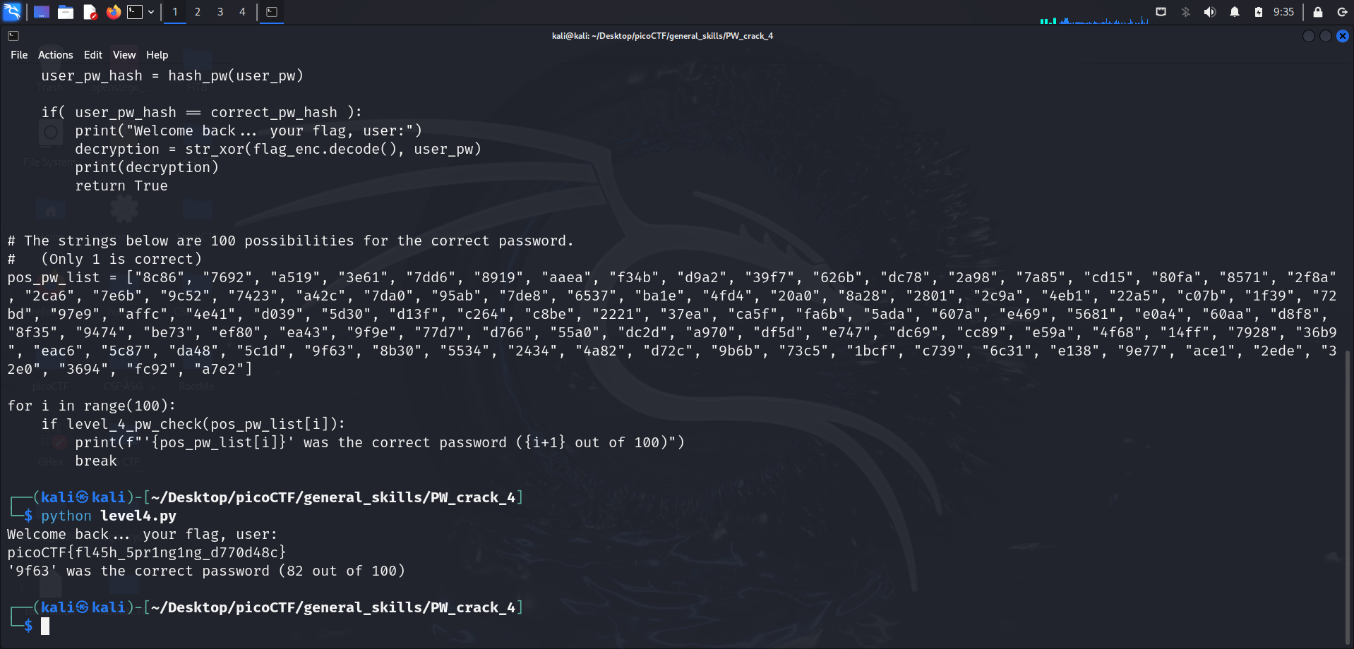 Interestingly, this challenge is extremely similar to PW Crack 3 challenge. However, in the previous challenge, we are provided with 7 possible passwords to attempt. This challenge gives us 100.