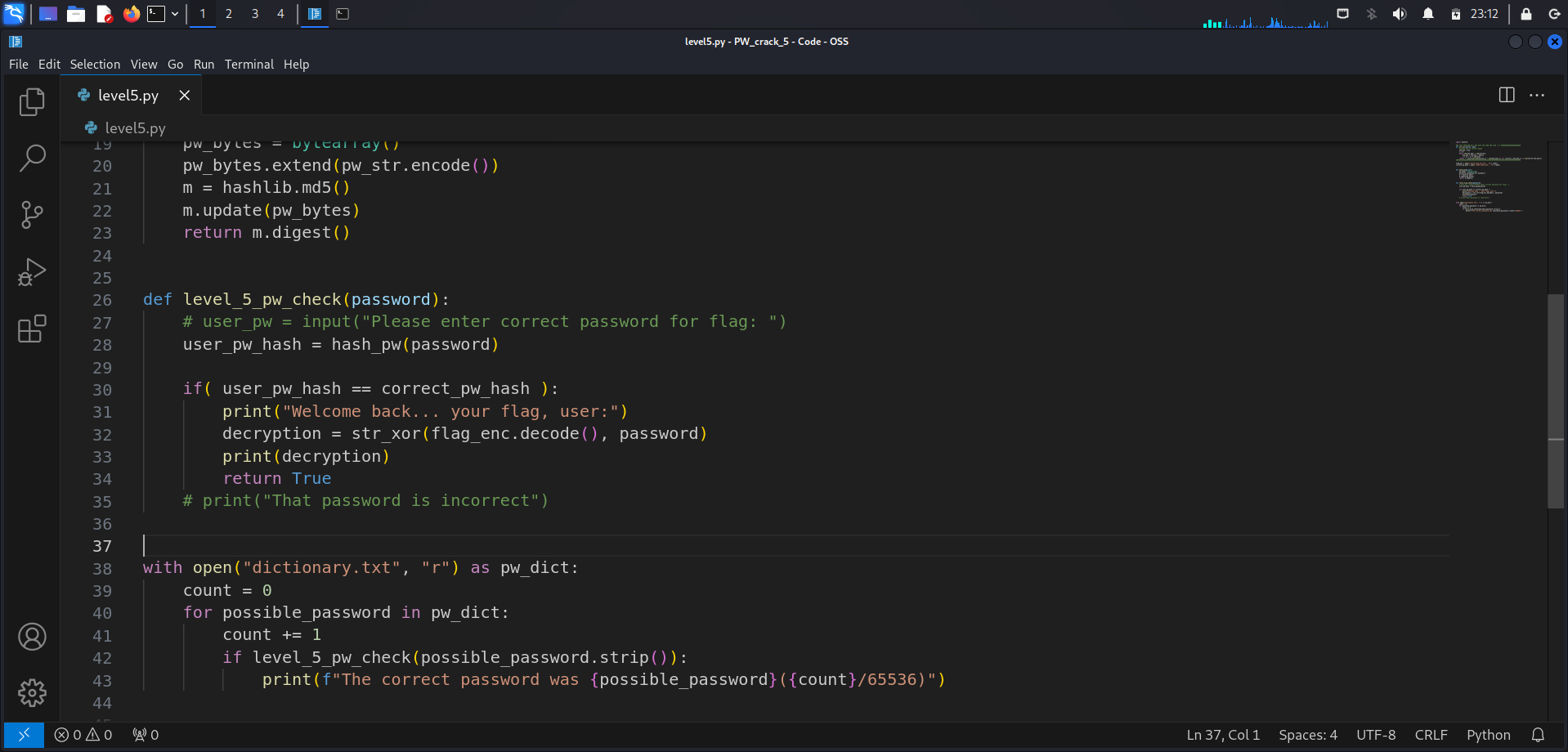 I’ve attached the script above as well. Running the script will display which was the correct password out of the 65536 potential passwords, as well as the flag.