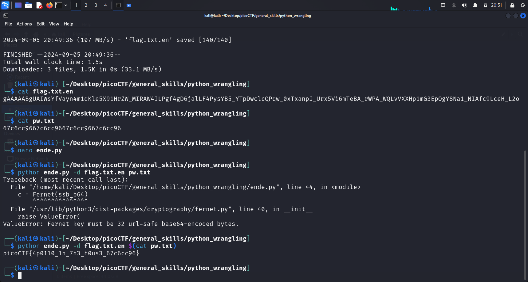 I ran nano to check the code in ende.py to understand what I have to do to successfully obtain the flag. The excerpt shown below handles the decryption process.