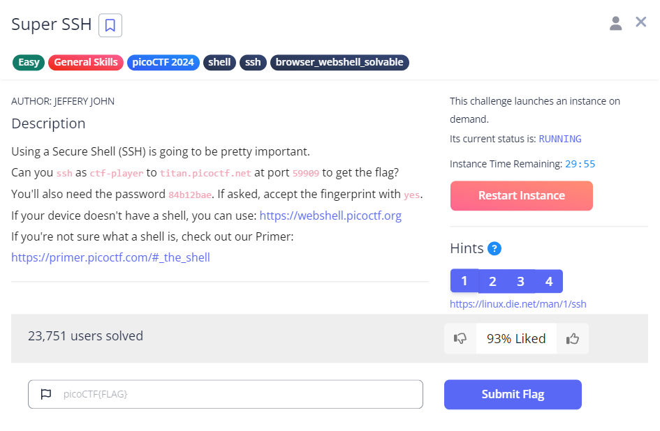 The main challenge is to come up with the SSH command to connect to their server. Thankfully, the SSH Linux man page was provided in one of the hints. Alternatively, running man ssh