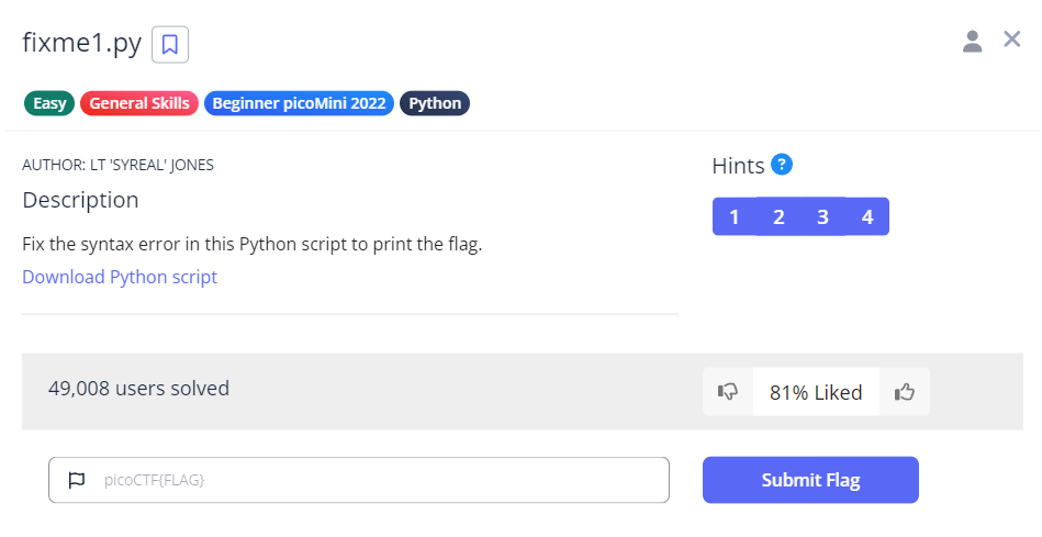 Alright, it looks like we just have to fix 1 simple syntax error to allow the flag to be printed successfully. Let’s download the challenge file using wget <link>