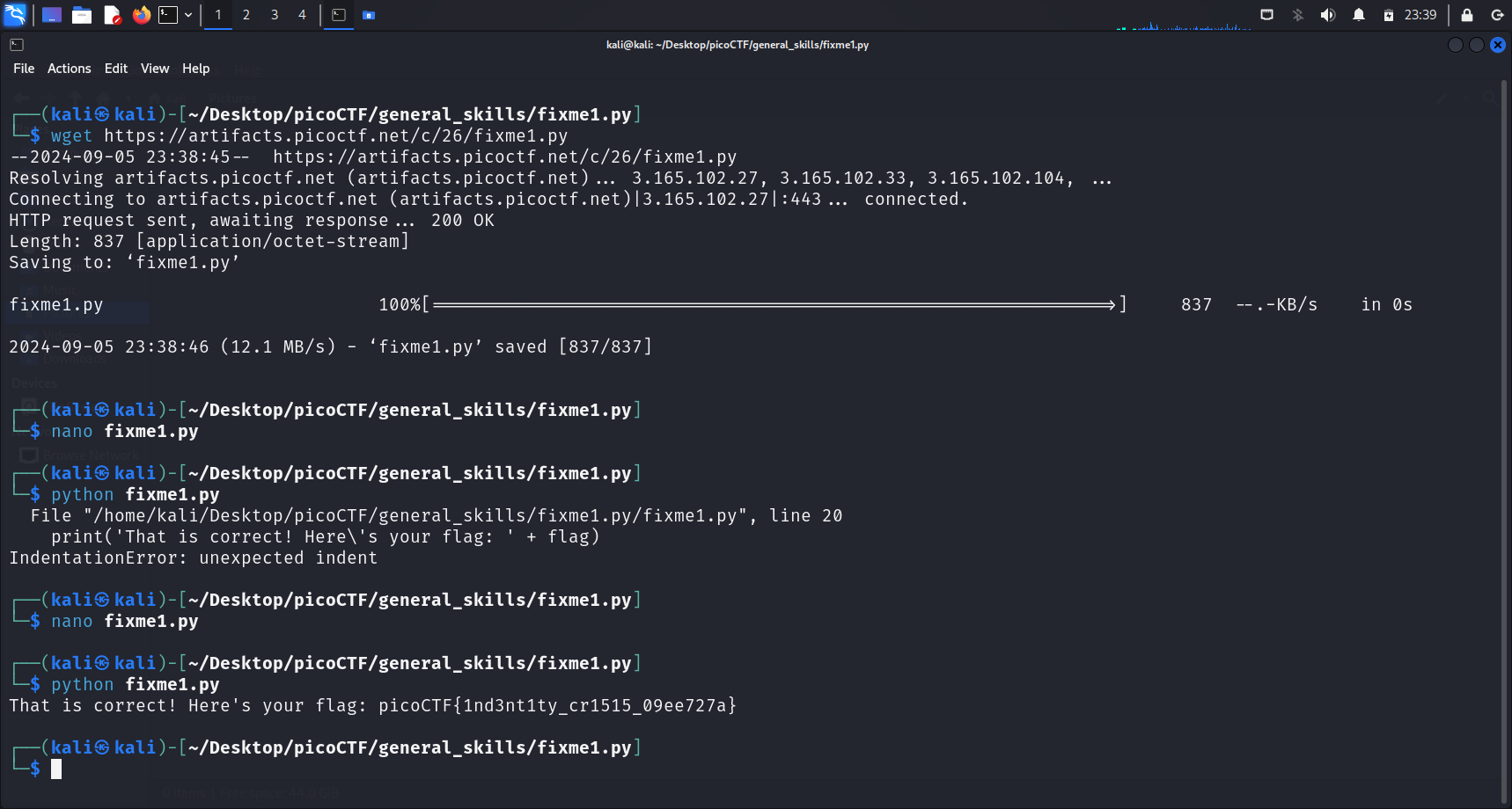 to edit it. Running the script again does not display any more errors, and awards us with the flag.