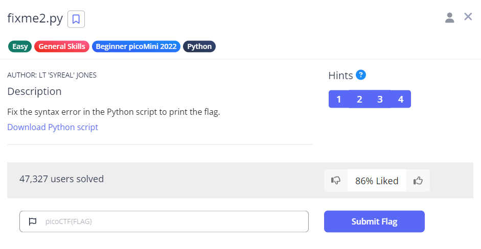 In this challenge, we are tasked to fix a single syntax error in the provided Python script. This challenge is highly similar to fixme1.py.