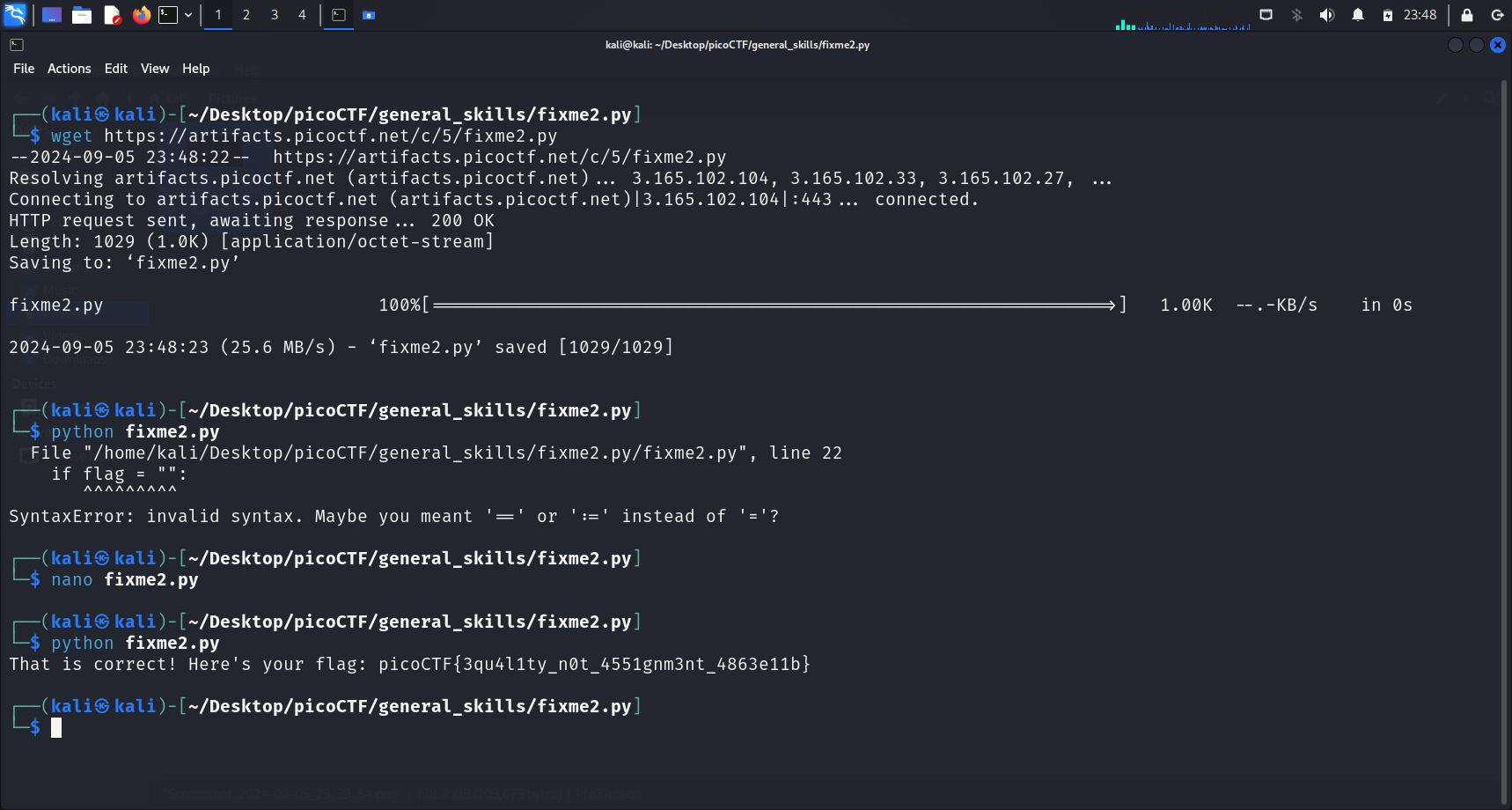 We can fix this syntax error by modifying the script using nano fixme2.py