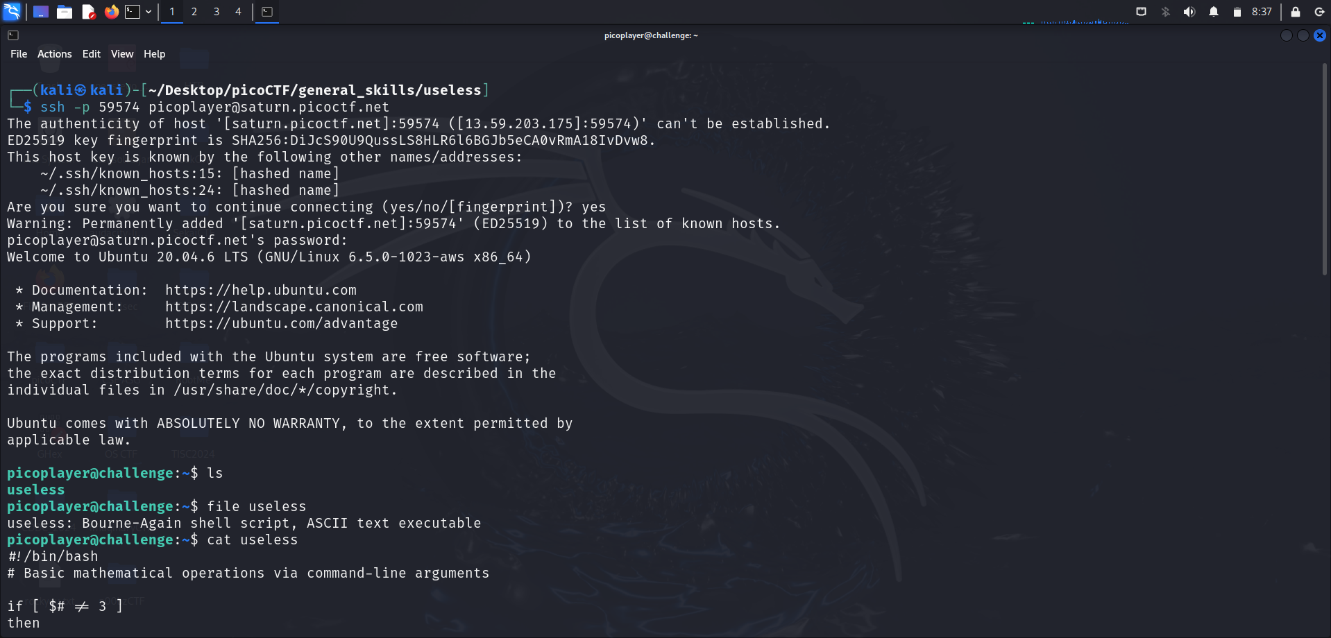 picoplayer@challenge:~$ cat useless#!/bin/bash# Basic mathematical operations via command-line argumentsif [ $# != 3 ]then echo "Read the code first"else if [[ "$1" == "add" ]] then sum=$(( $2 + $3 )) echo "The Sum is: $sum" elif [[ "$1" == "sub" ]] then sub=$(( $2 - $3 )) echo "The Substract is: $sub" elif [[ "$1" == "div" ]] then div=$(( $2 / $3 )) echo "The quotient is: $div" elif [[ "$1" == "mul" ]] then mul=$(( $2 * $3 )) echo "The product is: $mul" else echo "Read the manual" fifi