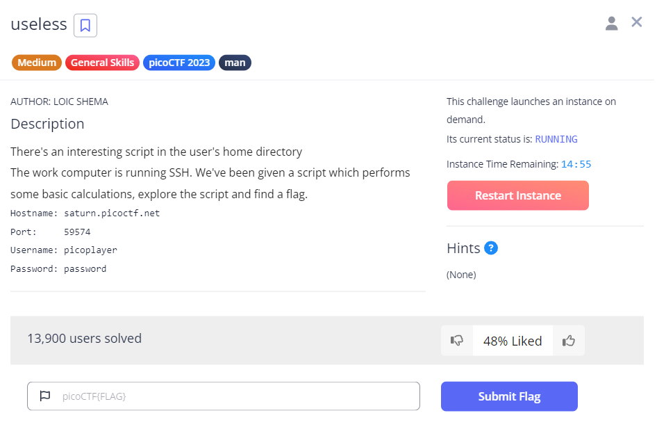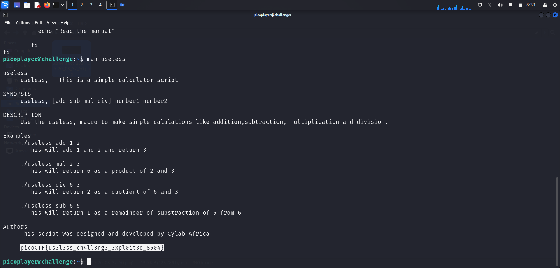 picoplayer@challenge:~$ man uselessuseless useless, — This is a simple calculator scriptSYNOPSIS useless, [add sub mul div] number1 number2DESCRIPTION Use the useless, macro to make simple calulations like addition,subtraction, multiplication and division.Examples ./useless add 1 2 This will add 1 and 2 and return 3 ./useless mul 2 3 This will return 6 as a product of 2 and 3 ./useless div 6 3 This will return 2 as a quotient of 6 and 3 ./useless sub 6 5 This will return 1 as a remainder of substraction of 5 from 6Authors This script was designed and developed by Cylab Africa picoCTF{us3l3ss_ch4ll3ng3_3xpl0it3d_8504}